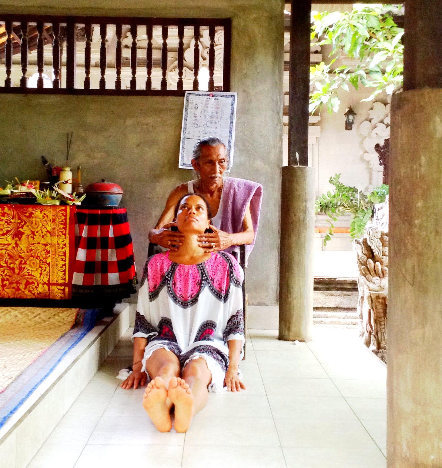 Tjokorda was thin as a rail but full of youthful vibrancy. As I entered the compound, a few people sat cross-legged watching him work on a young Australian woman.